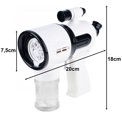 Пістолет для видування бульбашок має вбудований світлодіод на виході. Найкращого ефекту можна досягти ввечері. Бульбашки, які потім вилетять, виблискують різними кольорами.