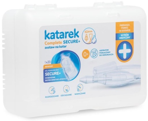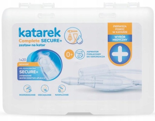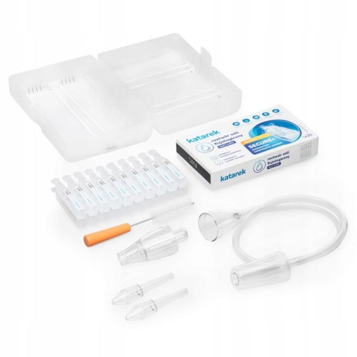Katarek Complete Secure+ — це набір для лікування застуди, який включає в себе аспіратор від нежиті, підключений до домашнього пилососа, 20 ампул фізіологічного розчину Katarek Secure+ і набір аксесуарів у зручній пластиковій коробці.