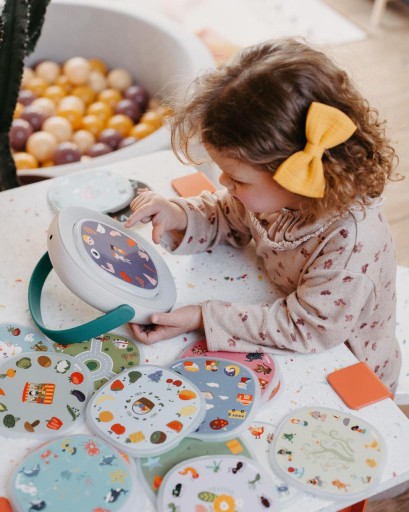 TIMIO працює прямо з коробки, без Інтернету та екрана. Просто натисніть кнопку, щоб вибрати свою мову. Потім покладіть магнітний диск на плеєр TIMIO, торкніться зображення та послухайте звуки, слова, музику, розповіді та вікторини. TIMIO настільки простий у використанні, що навіть найменші руки можуть грати з ним самостійно. Перегляньте також інші інтерактивні іграшки в нашому магазині!