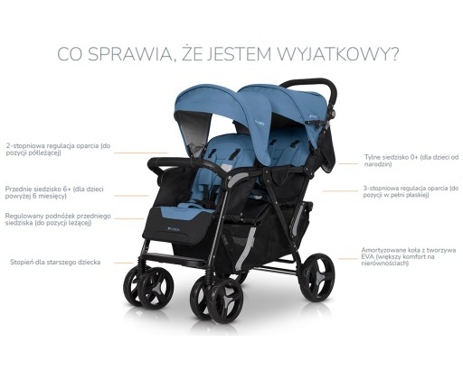 Коляска FUSION від Easy GO - це коляска-тандем. Це означає, що сидіння розташовані одне за одним. Завдяки такому рішенню він вузький і легко проходить через будь-який дверний отвір і на вузькі тротуари.