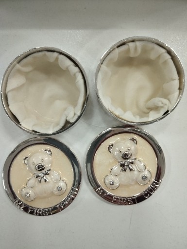 Шкатулка сріблясто-кремового кольору, прикрашена малюнком ведмедика.