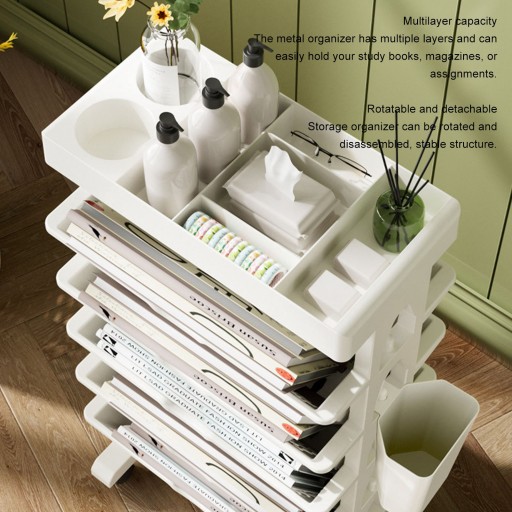 1. [Багаторівневе зберігання]: рухома книжкова полиця має кілька рівнів, що забезпечує достатньо місця для зберігання книг, журналів або домашніх завдань, зберігаючи ваші речі впорядкованими та легкодоступними.