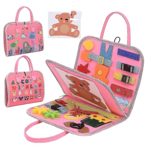 БАГАТО МАНІПУЛЯЦІЙНИХ ЕЛЕМЕНТІВ У сумці багато маніпуляційних елементів, таких як: блискавка, пряжки, шнурок, липучка, кнопка, декоративна застібка з ґудзиком, шнурок, шнурок. Все в привабливих кольорах і текстурах, які цікаві на дотик.
