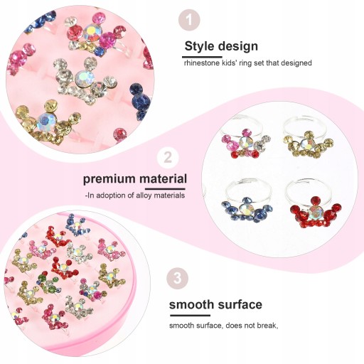 Для цих каблучок використовується сплав, вони не деформуються та не вицвітають. Унікальний зовнішній вигляд є креативним і милим для вашої маленької доньки, щоб носити та додати шарму. Дизайн корони та гірського кришталю легко поміщається навколо ваших пальців. Ви можете відправити ці набори своїй доньці, друзям у будь-які особливі дні.