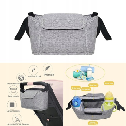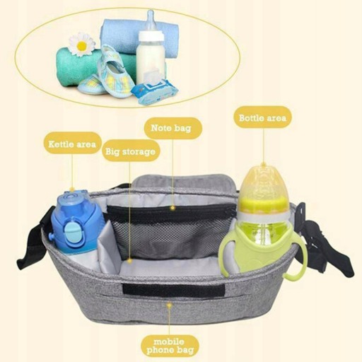 Велика місткість, з 2 тримачами для пляшечок для дитячих пляшечок або чашок, сітчасті кишені для дитячих паперових рушників, великий простір для пелюшок, іграшок, їжі, бічна кишеня для мобільного телефону