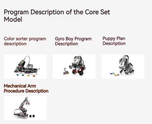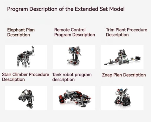 Цей електронний посібник містить загалом 15 інструкцій зі складання моделі. Методи кодування детально пояснюються для кожного кроку будівельного блоку та інструкцій із кодування. Ви можете створити 15 моделей відповідно до інструкцій і керувати ними відповідно до закодованих інструкцій. Дана модель має 4 ядра.
