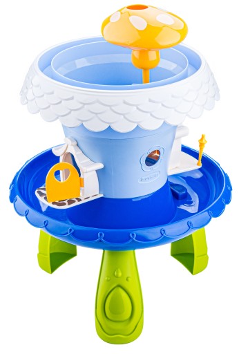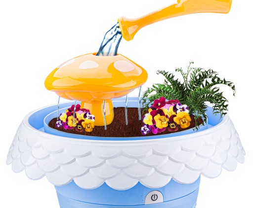 На верхній частині іграшки є гриб, який чудово полиє наші рослини. Просто налийте в нього води, щоб побачити справжній фонтан. Торець/рама верхнього горщика — це тунель, у який, наливши воду, ми побачимо подібний ефект. Вода стікає через 4 отвори і зрошує нижній рівень.