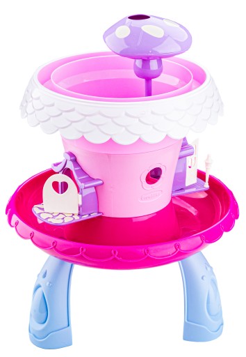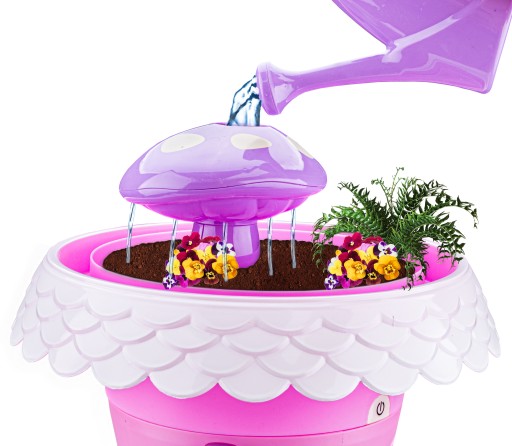 На верхній частині іграшки є гриб, який чудово полиє наші рослини. Просто налийте в нього води, щоб побачити справжній фонтан. Торець/рама верхнього горщика — це тунель, у який, наливши воду, ми побачимо подібний ефект. Вода стікає через 4 отвори і зрошує нижній рівень.