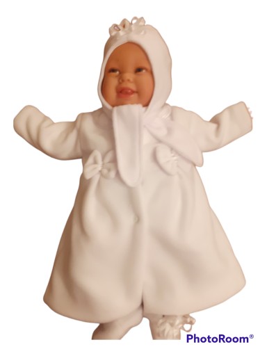 ЕЛЕГАНТНЕ БІЛЕ ФЛІСОВЕ ПАЛЬТО + 4 БЕЗКОШТОВНИХ БАНТА ВІД LINDERT — це м’яке біле флісове пальто з коміром, обробленим білою атласною обробкою, застібається на 3 пружини, рукава можна закатати, тому що всередині рукава 2-3 см флісу, пальто на підкладці з 100% бавовни білого трикотажу спереду і ззаду, дві складки спереду, декоративні флісові банти на складках і додатково 4 БАНТИ БЕЗКОШТОВНО / два рожевих в білий горошок і два темно-синіх в білий горошок / , які за бажанням можна додатково пришити до зовнішніх бантів на передній частині пальто. Потім ви можете використовувати пальто для інших випадків, ДИВІТЬСЯ НА ПРИКЛАДИ ФОТО КОМПЛЕКТІВ ПАЛЬТО ПЛЮС СУКНЯ НАШОЇ КОМПАНІЇ КОМІР КОМІР СУКНЯ ПОКАЗАНО ВЕРХУ КОМІР ПАЛЬТО ДУЖЕ ГАРНО ВИГЛЯДАЮТЬ, сміливо купуйте сукні-боді КУПУЮЧИ ПАЛЬТО ТА СУКНЮ ДЛЯ ТРАНСПОРТУВАННЯ СУКНІ ви нічого не платите РОЗМІРИ ПАЛЬТО довжина від плеча до низу 38 см ширина в пахва 25 см, довжина рукава від горловини 26 см від пахви 17 см.