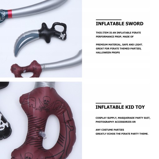 Цей предмет являє собою надувний піратський реквізит, виготовлений з преміального матеріалу, безпечний і легкий. Чудово підходить для піратських тематичних вечірок, реквізиту на Хеллоуїн, аксесуарів для косплею, маскарадних костюмів, фотоаксесуарів або костюмованих вечірок. ідеально підходить до теми піратської вечірки.