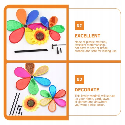 Цей вітряк має вигляд двошарового соняшника, який дуже барвистий і вишуканий. Виготовлений з пластику, безпечний для гри дітей. Завдяки приємному кольору та відмінній якості виготовлення це гарний вибір на подарунок для вашої дитини, він обов'язково їй сподобається. Це також чудова прикраса для вашого будинку, двору, саду тощо.