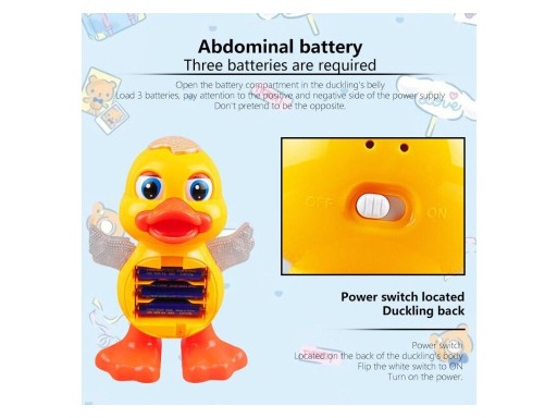 Коли ви його увімкнете, почнеться пісня, під час якої каченя почне робити багато речей одночасно: моргати очима, рухати дзьобом, махати крилами, рухатися вліво-вправо, повертати животом, видавати звуки та змінювати положення і напрямок ходьби. Додатково є крила і голова. Після того, як ви натиснете та припините відтворення, пісні зміняться на інші.