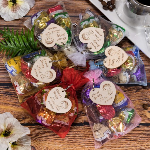 Подяки для гостей на хрестини однорічної дитини, з іменним дерев'яним брелоком і цукерками, все в пакеті з органзи.