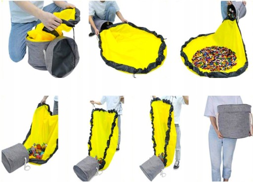 Виріб 2 в 1 має дві функції: це чудове рішення для зберігання та швидкого прибирання кубиків та іграшок. Однак килимок також призначений для гри. Він великий, діаметром 135 см і з’єднаний з кошиком за допомогою довгої липучки. Це значно полегшує скидання та збирання іграшок. Додатково в килимок вшита шнурок зі стопором, який при потягуванні перетворює його в мішок.