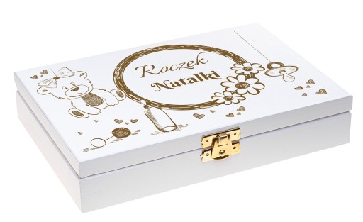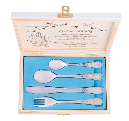 Дитячі столові прилади, поміщені в дерев'яну коробку - цікава ідея подарунка на хрещення або день народження. У набір входить якісна виделка, ложка, ложка і ложка. Декоративні столові прибори для дитини стануть приємним доповненням до їжі навіть для самого вибагливого. Крім того, ми можемо вигравірувати всі елементи зазначеним вами гравіюванням - наприклад, ім'я вашої дитини. Ми можемо вигравірувати індивідуальну присвяту на кришці скриньки за шаблонами, підготовленими нижче.