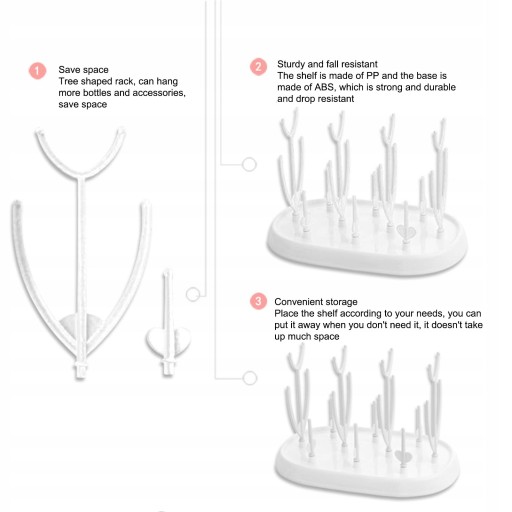 1. ТЕРМОСТІЙКІСТЬ: підставка для сушіння дитячих пляшечок виготовлена з високоякісного матеріалу, термостійкого до 120°C, довговічна та нешкідлива для здоров'я.