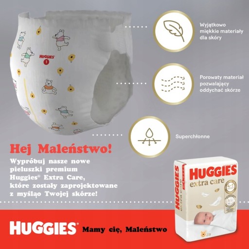 Нові, модернізовані* підгузки Huggies Extra Care - це нова версія відомих і популярних підгузників преміум-класу Huggies Elite Soft. Вони були розроблені спеціально для дитячої шкіри, яка втричі м'якша і чутливіша за шкіру дорослих. Підгузки Huggies Extra Care гіпоалергенні та схвалені дерматологами, підходять для шкіри, схильної до подразнення.