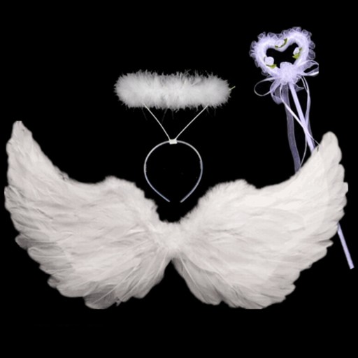 Білі крила ангела вкриті пір'ям. Плюс німб з білого пуху. Ідеальний комплект для різдвяних вечірок або шкільних вистав. На крилах є ремені для одягання, а на німбі є пов'язка.