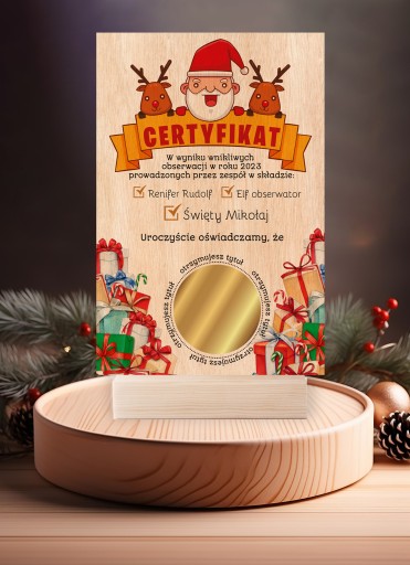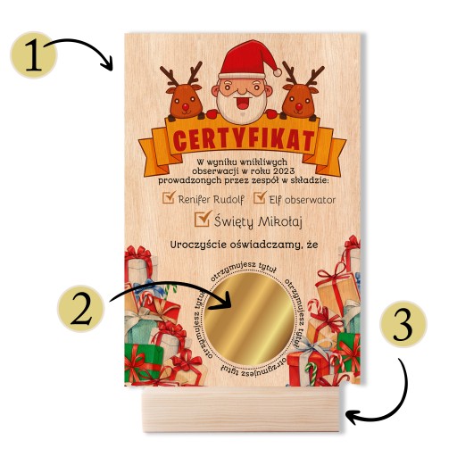 Сертифікат виготовлений з дерев'яної фанери товщиною 3 мм і поставляється з дерев'яною підставкою.