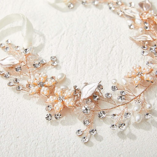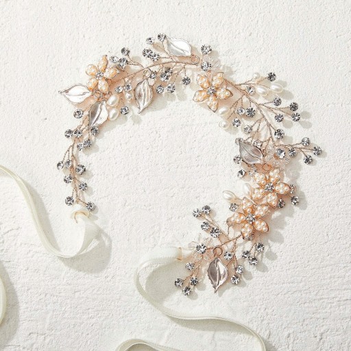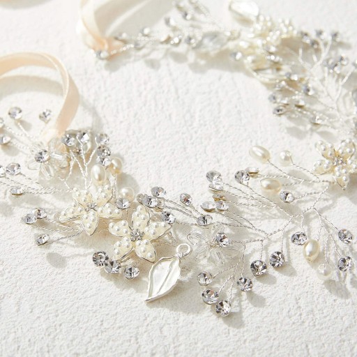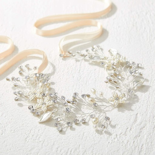 Головний убір для дівчинки/дівчинки ручної роботи має ніжно-білі (світло-слонова кістка) імітацію перлів, прозорі кристали, прозорі намистини та знімну атласну стрічку.