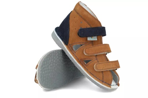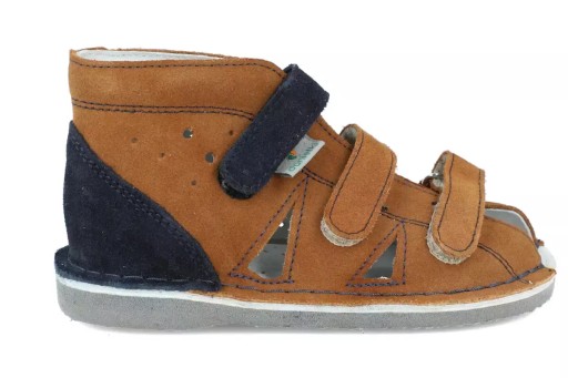 - Верх виготовлений з м'якої шкіри нубук коричневого кольору. Темно-синій каблук, ремінець і шви чудово контрастують з верхом. Ремені можна використовувати для регулювання щільності взуття, а також для ідеальної посадки ортопедичної або супінаційної устілки.