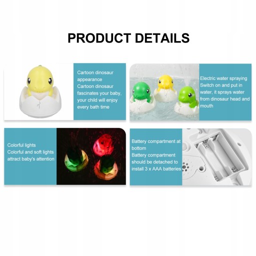3. Різнокольорові вогні: ця іграшка для ванни з динозавром із м’яким і різнокольоровим світлом може нескінченно розважити вашу дитину під час купання та привернути її увагу.