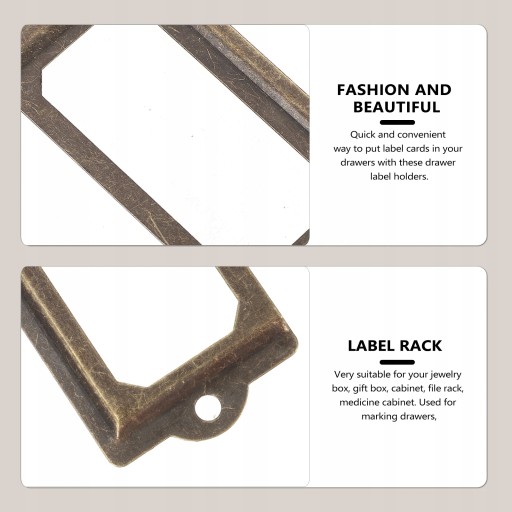Міцні та довговічні рамки етикеток для ящиків, в які можна розміщувати картки з етикетками, стійкі до зносу та мають дуже тривалий термін служби. Простий стиль рамок для етикеток для ящиків додає яскравий ретро-стиль до будь-якого стилю дверей шафи, вишуканого та старовинного.