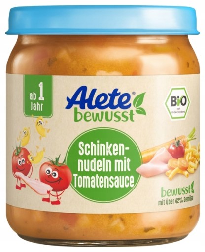 Інгредієнти: вода, морква * 25%, томатне пюре * 17,5%, макарони * варені 12% (тверда манна крупа, яєчний білок), шинка і свинячі відбивні * (без консервації) 8%, цибуля *, рисова манна крупа *, крохмаль *, насіння ріпаку. олія*, олія соняшникова*, сіль йодована, петрушка*, перець*. * з органічного виробництва