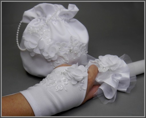 Набір для причастя: атласний мішечок у формі мішечка з посиленою вставкою, яка допомагає зберігати форму навіть при навантаженні. Сумка виготовлена з першокласного весільного атласу та прикрашена численними 3D аплікаціями. Рукавички без пальців також прикрашені елементом такої ж аплікації. В ціну свічка не входить!!!
