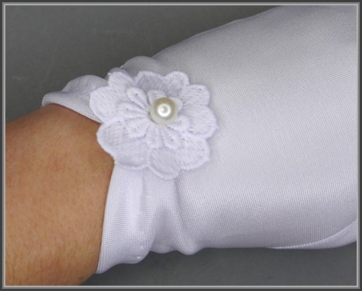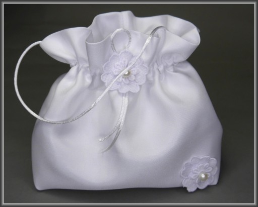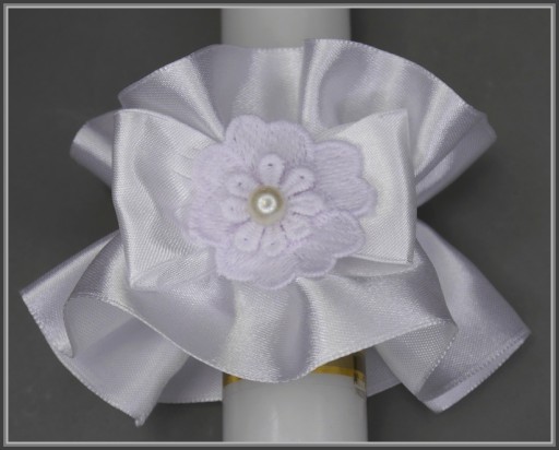 Набір для причастя, який ідеально підійде до альби чи сукні для причастя, включає: свічку-крапельницю, рукавички та сумку у формі мішечка з прямим дном, виготовлену з тонкого атласу, прошитого з матової сторони. Всі елементи набору прикрашені квіткою-кодером з перлів.