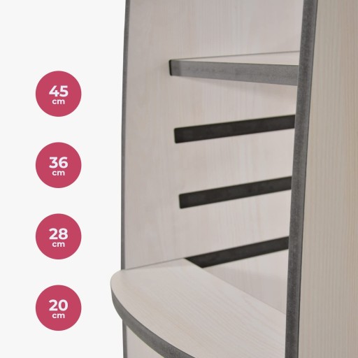 Він міцний, компактний і міцний, тому що росте разом з вашою дитиною завдяки ручкам, що регулюються в 4 положеннях. Його поверхні антибактеріальні, тому потребують хімічного очищення. Його верхня частина знаходиться на висоті 50 см від землі, єдина на ринку така висока, щоб допомогти навіть найменшим дітям, і підходить від 9 місяців до 6 років, з максимальним навантаженням 40 кг.