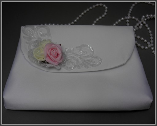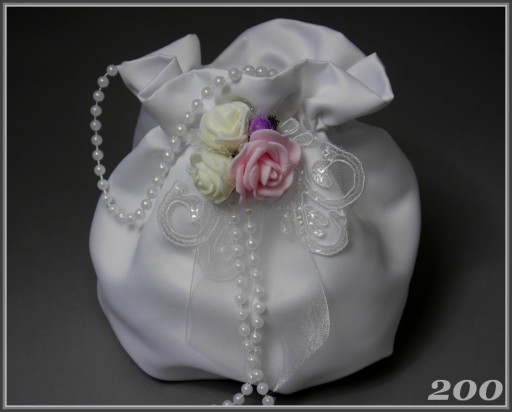 Атласна сумка прямокутної форми, прикрашена мереживною аплікацією з різнокольоровими шпильками. Сумка має жорстку вставку, яка допомагає зберегти форму сумки. Ви можете підібрати сумку до сумки на інших наших аукціонах, наприклад, рукавички, свічку з атласу та тюлю та вінок. Польський продукт