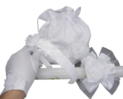 Набір для причастя: атласний мішечок у формі мішечка з посиленою вставкою, яка допомагає зберігати форму навіть при навантаженні. Сумка виготовлена з першокласного весільного атласу та прикрашена численними 3D аплікаціями. Рукавички на п'ять пальців, капелюшок і пов'язка, також прикрашені елементом такої ж аплікації. В ціну свічка не входить!!!