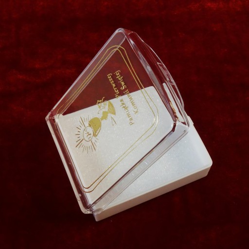причастя Біла пластикова коробка, кришка прозора. Чохол прикрашений міцним золотим євхаристійним принтом.