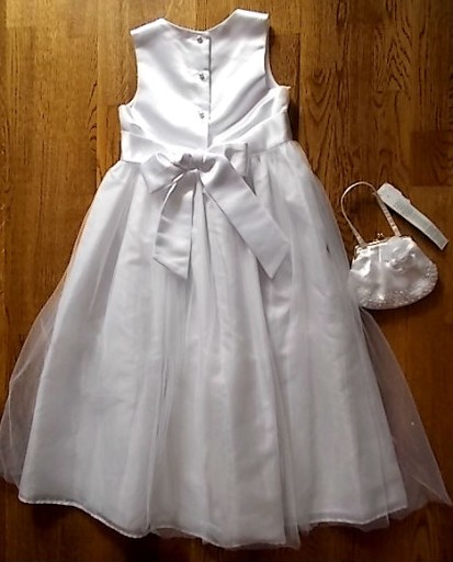 Чудова елегантна сукня з болеро для причастя, дуже ефектна, елегантного білого, злегка жорсткого атласного матеріалу (з мінімальним блиском, прикрашена вишивкою метеликами та стразами на ліфі та болеро. Пояс на талії - поясок на зав'язування ззаду.D, 3 шари, верх з тюлю з блискучими стразами, біла спідниця всередині та додаткова підкладка з шаром тюлю, що подовжує довжину сукні.Застібається ззаду на перлинні гудзики.Сукня в + в дуже хорошому стані,красива,дуже елегантна!!!Атласна сумка вишита бісером та прикрашена білою квіткою - нова Crcia виглядає неймовірно!!Фото не відображає її справжнього шарму!!!ДУЖЕ РЕКОМЕНДУЮ!!!!