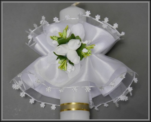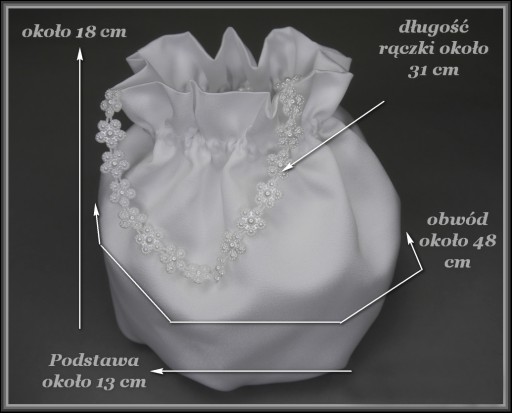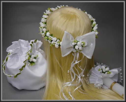 Набір для причастя: капельник для причасних свічок і мішечок у формі мішечка з першокласного весільного атласу. Сумка має жорстку вставку, яка допомагає зберігати форму навіть під навантаженням. Сумка прикрашена чарівною заплетеною косою та шпилькою з поролонових дзвіночків. Ми підготували вінок для причастя, щоб завершити набір, доступний на інших наших аукціонах.