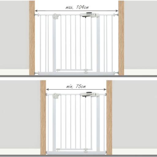 Ширина воріт регулюється за допомогою 4 гвинтів з гумовою кришкою, тому ви можете адаптувати їх до різних місць у вашому домі. У комплект також входять два подовжувачі по 10 см, які дозволяють адаптувати ворота до різної ширини дверної коробки та сходів.