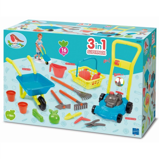 Цей чудовий набір для садівника сподобається дітям, які люблять допомагати дорослим у садівництві. Це ідеальна пропозиція для теплих весняних і літніх днів. У набір входить газонокосарка для маленьких садівників, тачка, кошик і численні аксесуари, такі як граблі, сапа, лопата, квіткові горщики та імітація овочів. Легка, безпечна і зручна для маленьких рук косарка має двигун «згоряння» з рукояткою стартера, яка працює як у справжніх газонокосарках - ви чуєте характерний звук (батарейки не потрібні). Кришка паливної горловини має кришку, що відкручується. Використовуючи тачку зі зручною ручкою, діти можуть перевозити свій садовий інвентар або землю для посівів. У набір також входять аксесуари, які збагатять гру, такі як кошик, садовий інвентар, квіткові горщики та імітація овочів. Все це виконано в приємних, яскравих кольорах, які сподобаються як хлопчикам, так і дівчаткам.