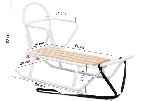 Санки виготовлені польським виробником з товстої сталевої труби та міцного сидіння з букових дощок. Наші санки мають широку стійку, тому їх важко перекинути. Спинка була посилена для безпеки дитини, що відрізняє наші санки від інших, представлених на ринку.