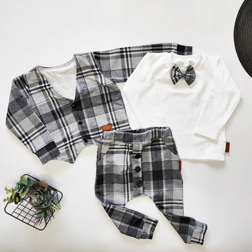 Елегантний і зручний одяг для хлопчика в модну клітку в чорно-сірих кольорах.Красиво виглядає і дуже зручний для дітей, не сковує рухів і не обмежує активності.Унікальне поєднання кольорів і аксесуарів робить його ідеальним нарядом на хрестини, дні народження чи привітання.інші важливі свята для кожного хлопчика.