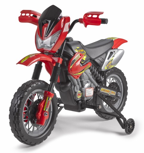 Акумуляторний мотоцикл Feber із зовнішнім виглядом кросового мотоцикла – мрія багатьох хлопців. Мотоцикл виготовлений в Іспанії з високоякісного матеріалу, стійкого до погодних умов і УФ-випромінювання. Газ і гальма знаходяться в важелі. Мотоцикл оснащений світловими та звуковими ефектами. Транспортний засіб може рухатися зі швидкістю до 3 км/год з надзвичайною стійкістю (завдяки бічним колесам), забезпечуючи безпеку вашої дитини.