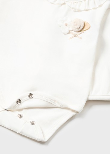 Боді-пачка з пов'язками для дівчинки. Боді з довгим рукавом. Ззаду застібається маленькими кнопками, що полегшує одягання. Застібка на промежині для легкого надягання. Прикраси: декоративні рюші. Колготки з воланами.