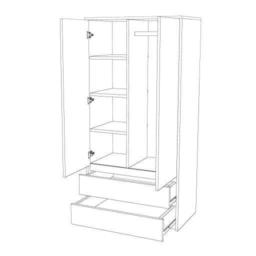 - Місткість та організація: наша гардеробна оснащена 2 висувними ящиками, 2 дверцятами та полицями, що дозволяє легко організувати ваш одяг, аксесуари та інші речі.