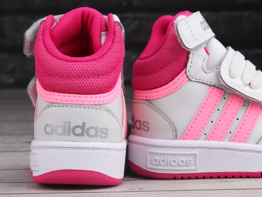 Легендарні Adidas Hoops у молодшій версії. Взуття відрізняється більш високою конструкцією з коміром навколо щиколотки. Верх покритий синтетичним матеріалом, що робить його міцним у використанні. Як зручну альтернативу класичній шнурівці бренд використовує широкий пояс на суцільній липучці, що робить повсякденне надягання та зняття ефективнішим. Бічні панелі традиційно прикрашені 3 фірмовими смугами.