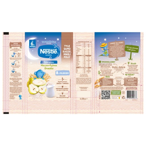 Повноцінне харчування без глютену зі смаком груші, адаптоване до потреб і можливостей немовлят і маленьких дітей. Молочно-рисова каша Goodnight Pear від Nestl містить імунонутрієнти* (цинк, залізо, вітаміни А** і С), йод, АЛК (омега-3), 11 вітамінів і бактеріальні культури Bifidobacterium lactis.