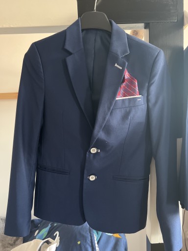 Продам темно-синій костюм (піджак + брюки) з сорочкою, туфлями, метеликом і карманом (в кольорі).Брюки розгорнуті (підкат), на резинці на талії.