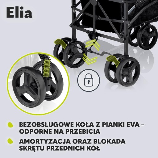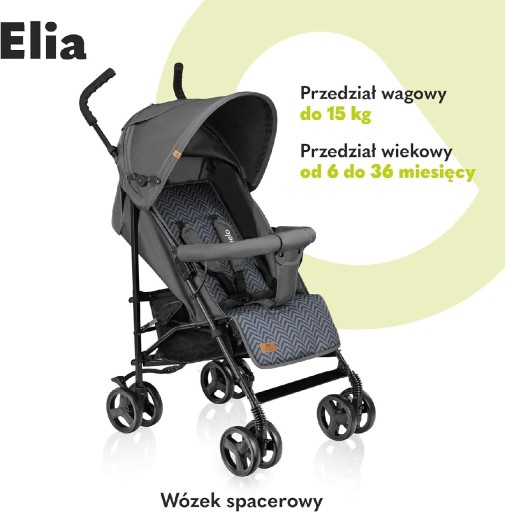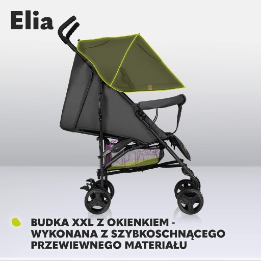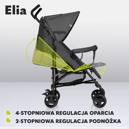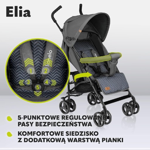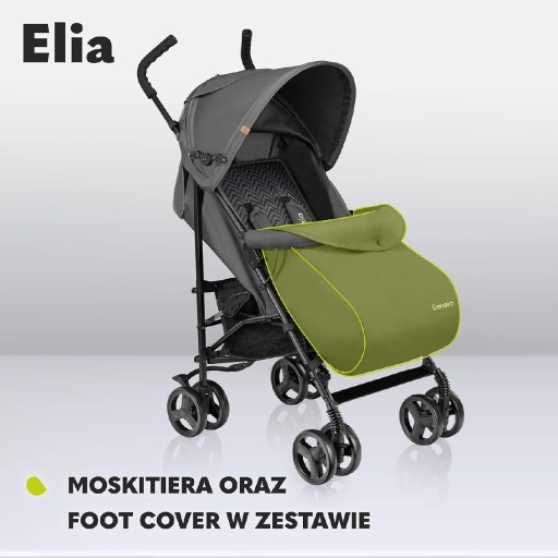 У КОМПЛЕКТ ВХОДИТЬ: коляска Elia, москітна сітка та грілка для ніг, регульована спинка та підніжка, велика корзина для покупок, зручна ручка для перенесення, 5-точкові ремені, зручні кишені.