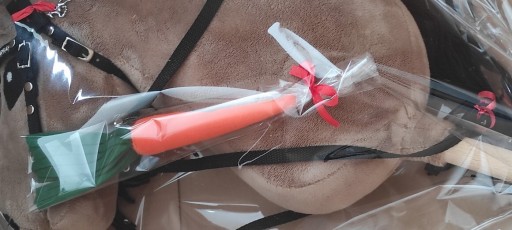 Вказана ціна за коня кольору мокко з чорною гривою та білий варіант з палицею, вуздечкою, поводами, лоном та безкоштовними подарунками: медальйоном коня, що скаче (біля вуздечки) та морквиною.