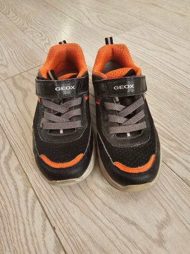 Предмет продажу кросівки Geox chopice чорно-сірі з помаранчевими елементами 32 розмір. Стан як на фото, в цілому хороший, на підошві невеликі потертості. Взуття має дихаючу та водонепроникну підошву з технологією Geox Respira. Звичайна ціна 239,99 злотих.