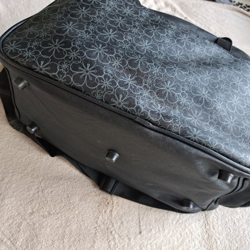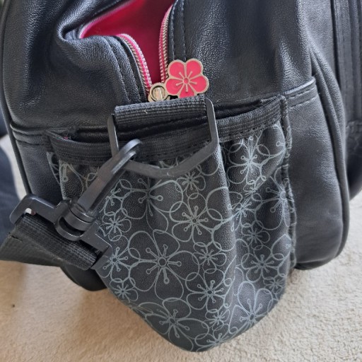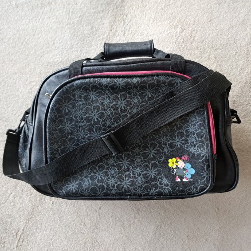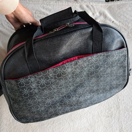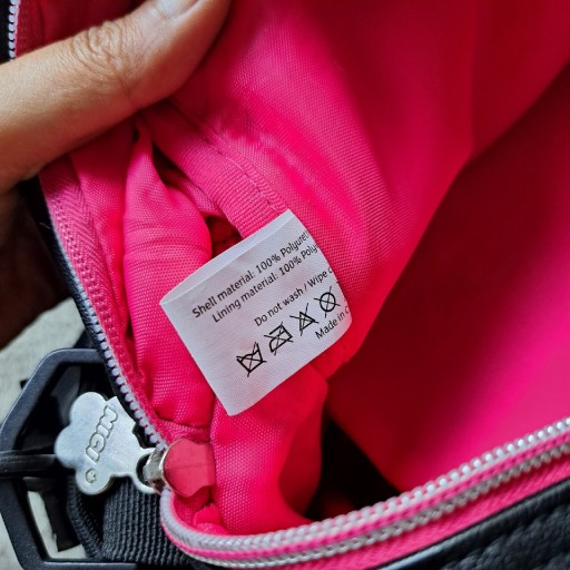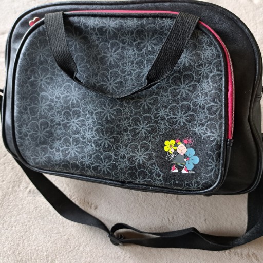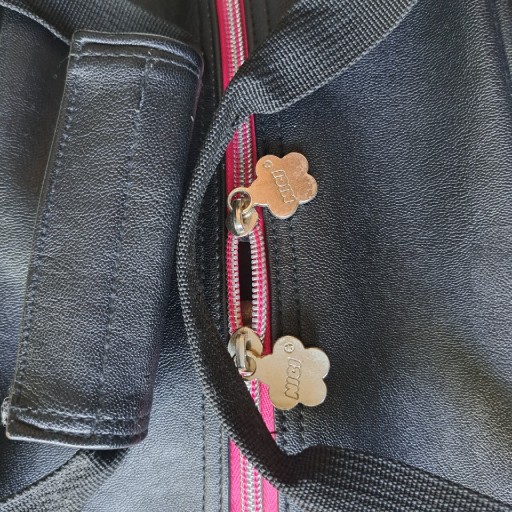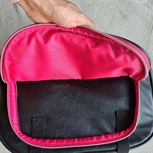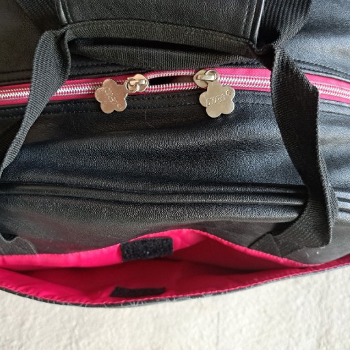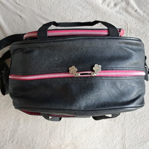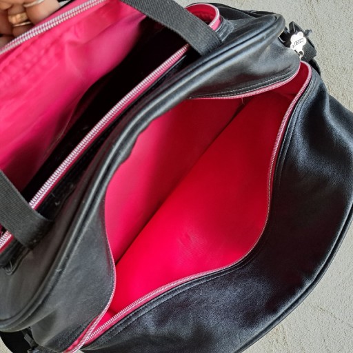 Красива обробка - багато кишень. Дно посилене - на дні є мішок. Аля шкіра. Підкладка - фліс і блискучий амарант. Блискавка зі срібла та амаранту. Чорний, широкий, знімний і регульований плечовий ремінь.